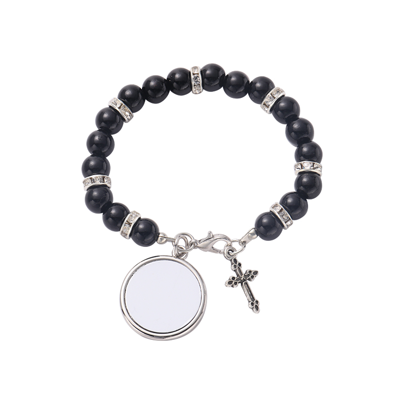 Overview: Classic rosary-made bracelet in the market. 22pcs of the 8mm beads and 7 extra metal charms made, connected by a adjustable rubber band, wearable for all wrists. With low-profile black beads it used on this one, wide range occasions it will be suitable for: Funeral, Wedding, Baptism, Religious or just as daily decoration.